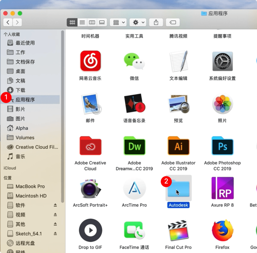 1、在访达左侧找到“应用程序”入口,点进去后,找到“Autodesk”的目录(前提是已安装了AutoCad),并进入目录,如下图: