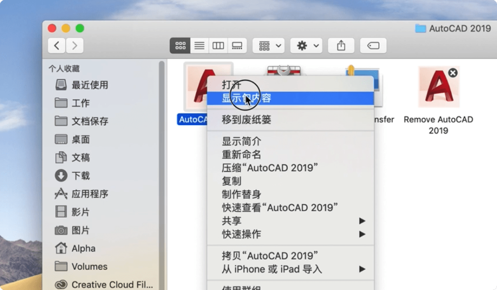 2、然后进入AutoCad 2019 目录(这里看你安装的是什么版本,如果是2020 就是Auto Cad 2020),然后在应用程序上用鼠标右键,在菜单中选择“显示包文件”,如下图: